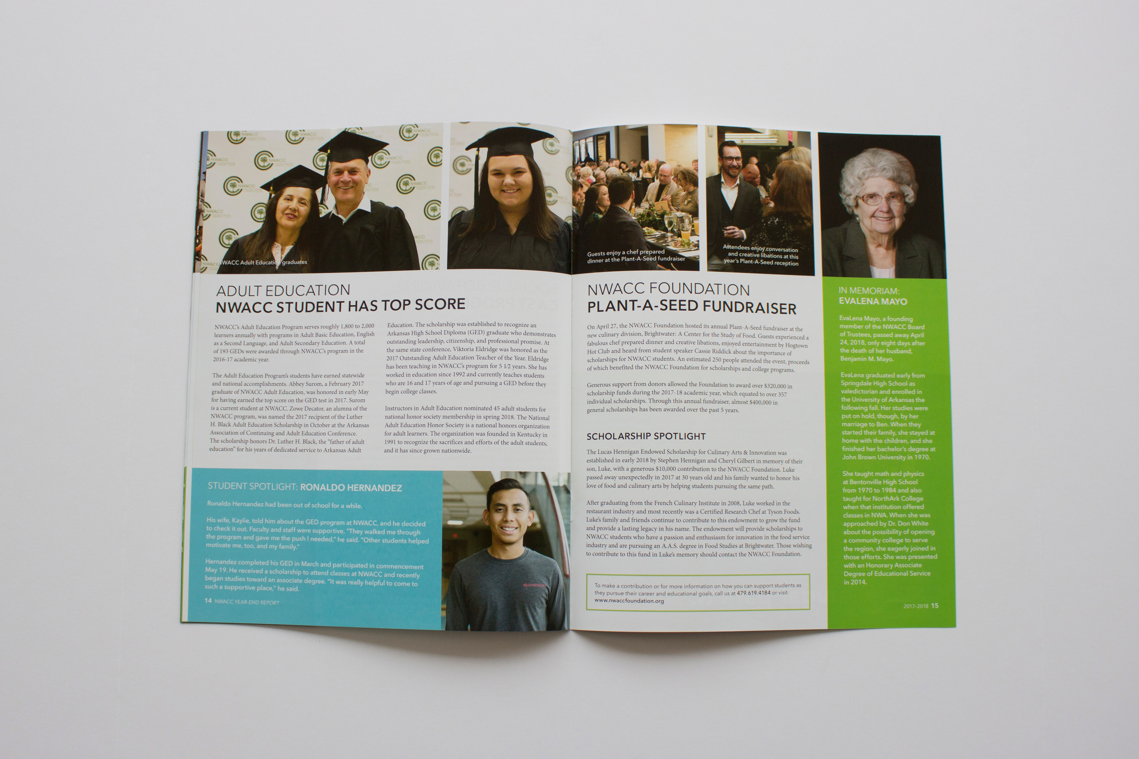 NWACC serves its community well, and I wanted the design of this piece to be simple, yet impactful to let all their accomplishments shine. I created several spread options to meet the needs of the different areas featured. Overall, I think this publication represents the college brand well and brings their look up to speed with their peers.